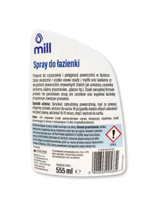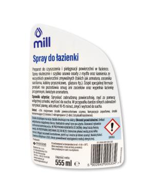 Płyn czyszczący MILL to preparat do czyszczenia i pielęgnacji powierzchni w łazience. Spray skutecznie i szybko usuwa osady z mydła i kamienia ze wszystkich powierzchni zmywalnych (armatura, ceramika sanitarna, kabiny prysznicowe, glazura itp.). Produkt nie pozostawia smug i zacieków.