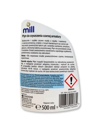 Płyn do czyszczenia czarnej armatury Mill Clean skutecznie i szybko usuwa osady z mydła i kamienia, z barwionych na czarno lub innego koloru powierzchni takich jak: